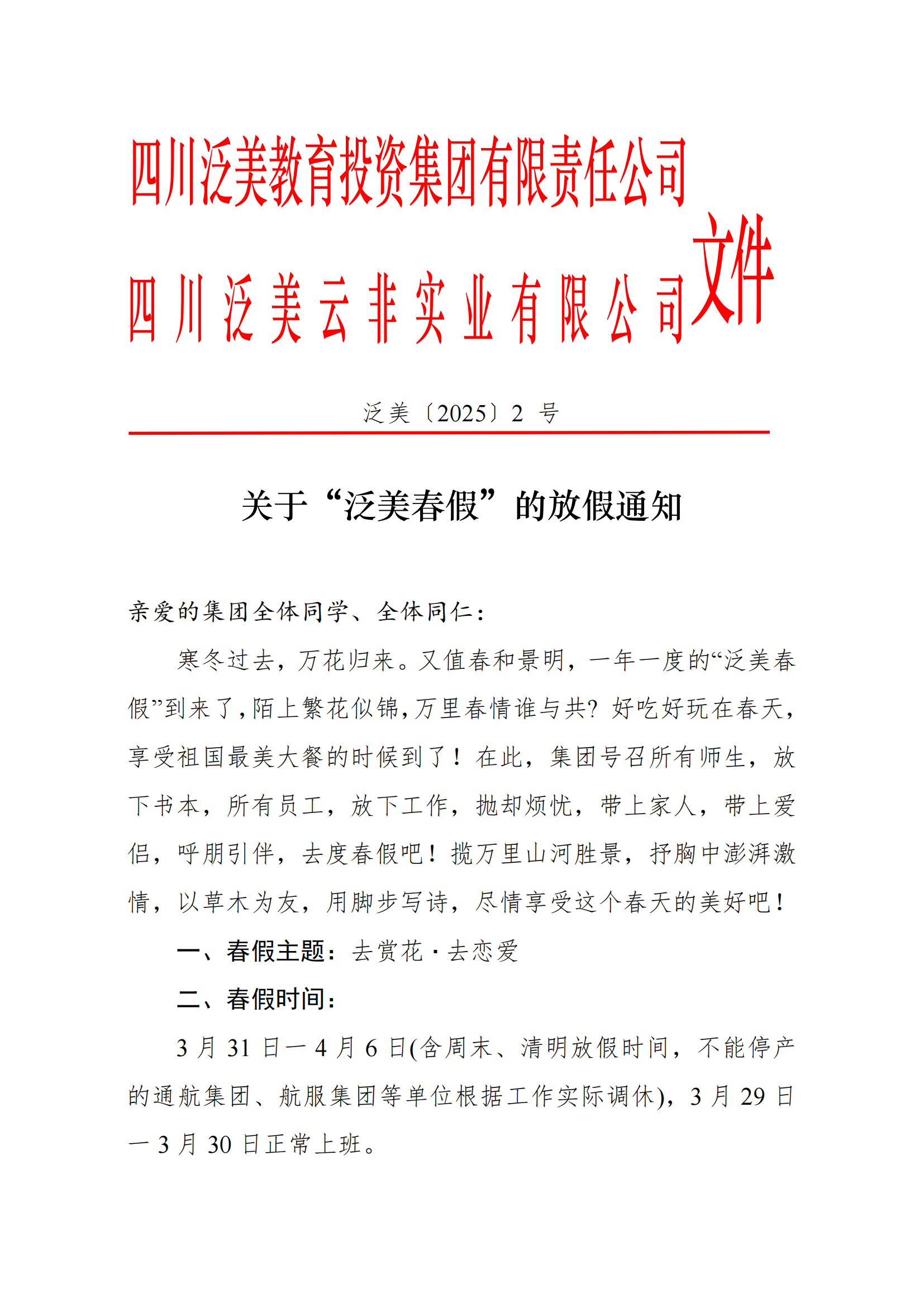 为了实现与国际教育接轨,更好体现集团创新办学的职教理念,培养学生亲近自然、热爱生活的情怀和态度,彰显“传承善与美德、传递爱与快乐”的教育精神,持续打造有人文关怀、有创新活力的泛美精品教育,按照国办发[2013]10 号文件《国民旅游休闲纲要(2013 —2020)的通知》精神,经集团研究决定,在放假时间总量不变的情况下,从 2019 年起实施放春假的制度。