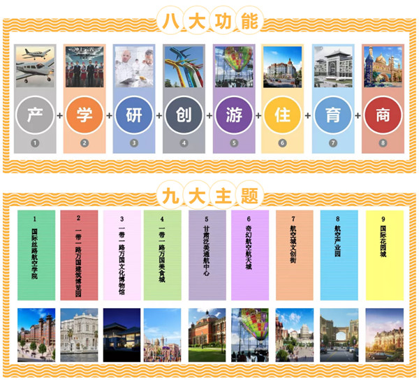 甘肃兰州丝路之光国际航空项目计划投资约86亿人民币,具备“产、学、研、创、游、住、育、商”八大功能,包含国际丝路航空学院、一带一路万国建筑博览园、一带一路万国文化博物馆、一带一路万国美食城、甘肃泛美通航中心、奇幻航空航天城、航空城文创街、航空产业园、国际花园城九大主题。