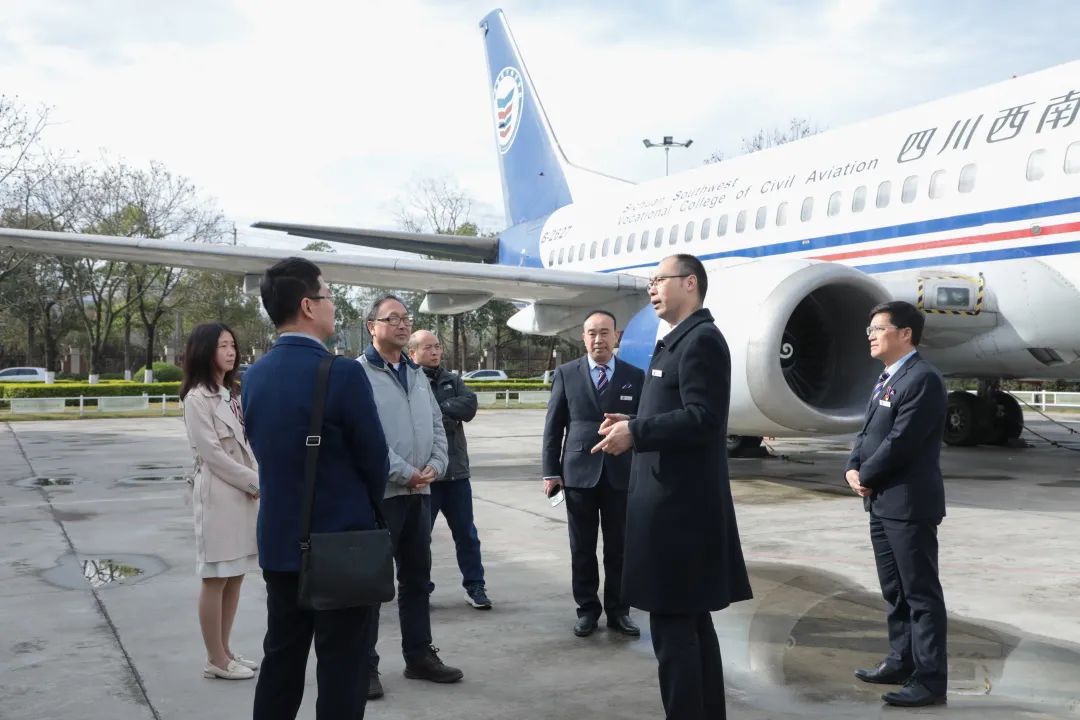 仪式前,在学院领导的陪同下,西南交通大学材料科学与工程学院院长陈辉一行参观了我院人文经典校园、一流实训中心等,近距离走进机务CCR-147培训中心、发动机与拆装、电工与电子技术等实训室,感受实训课堂。在参观过程中,陈辉对我院的实训建设及学生的专业技能给与赞赏,双方产教融合、校企合作的育人模式等展开了深入交流。